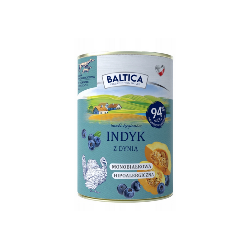 Bezzbożowa, monoproteinowa karma mokra dla psów dorosłych. Wykwintna uczta, stworzona na bazie delikatnego mięsa indyka z dodatkiem dyni i borówki. Stanowi fundament wysokostrawnej diety skomponowanej z jednego rodzaju mięsa w celu ograniczenia wystąpienia reakcji alergicznych