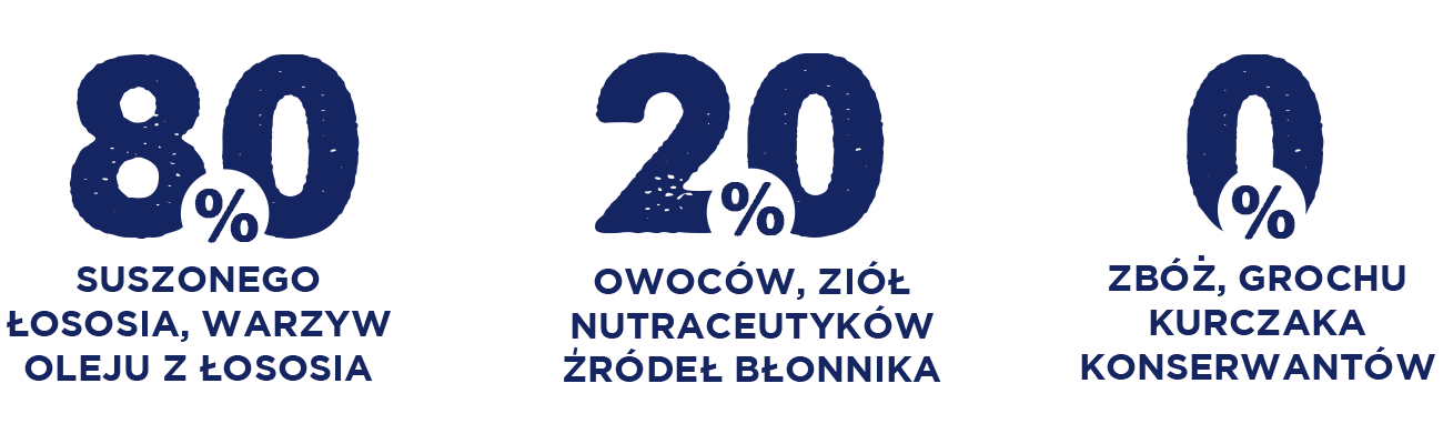 łosoś min. 45,5 % (suszony łosoś bez ości min. 36%, świeży olej z łososia 9,5%), suszone ziemniaki (29,5%), pulpa buraczana, wytłoki lniane, jabłka, drożdże browarniane, minerały, czarna porzeczka, pietruszka (2,5%), dynia (1,5%), gruszka (0,5%), ostropest plamisty (0,5%), beta-glukan, ziele czystka (Cistus L.), glukozamina (0,030%), chondroityna (0,015%), mannooligosacharydy (MOS), fruktooligosacharydy (FOS). Naturalny przeciwutleniacz z tokoferolem i wyciągiem z rozmarynu