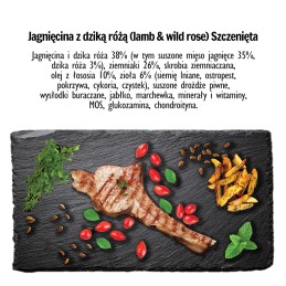 ● 80% zawartości jagnięciny, dzikiej róży, oleju z łososia, ziemniaków oraz ziół