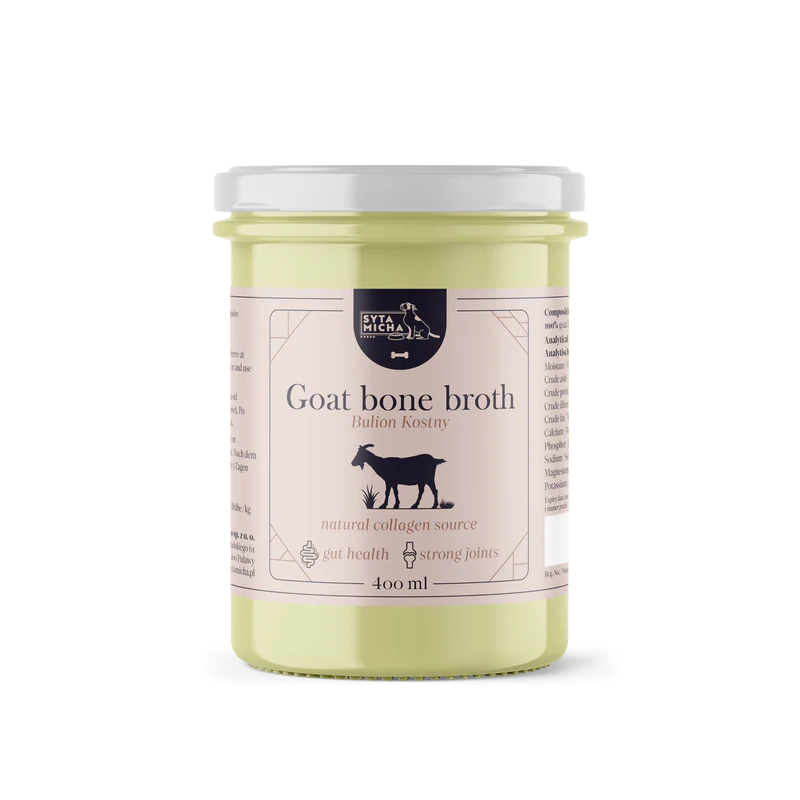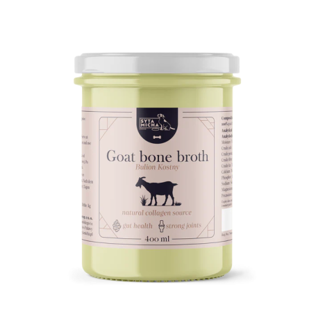 Nasz bulion z kości kozy powstaje w procesie powolnego gotowania przez prawie całą dobę. Taka forma obróbki termicznej pozwala wydobyć z kości wszystko to co najlepsze i najzdrowsze dla naszego psiaka. Ponadto, bogaty wachlarz składników odżywczych zawartych w kozim wywarze od Sytej Michy podnosi parametry zdrowotne psa, w tym usprawnia pracę układu odpornościowego, pokarmowego, nerwowego i kostno-stawowego.