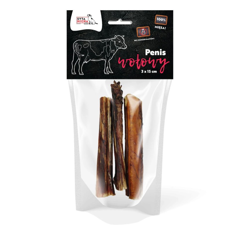 Suszony penis wołowy Syta micha to w 100% naturalny gryzak dla psa, stanowiący uzupełnienie jego codziennej diety.
