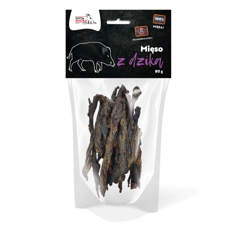 Jeżeli szukasz naturalnych smakołyków dla psa wykonanych z najwyższej jakości szynki, biodrówki, schabu oraz łopatki dzika, to Syta Micha będzie doskonałym wyborem. Kilogram produktu wyrabiany jest z 4 kilogramów mięsa.
